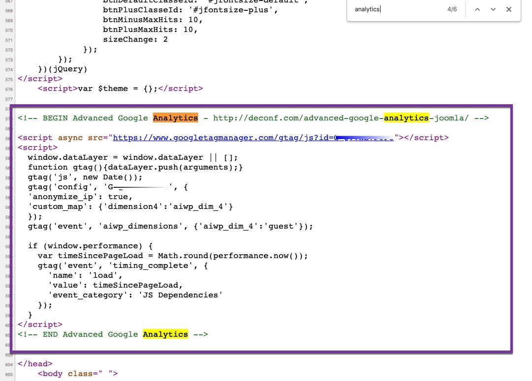 ค้นหา code ด้วยคำว่า Analytics ถ้าใส่ถูกต้องจะเห็น code แสดงอยู่ตามตัวอย่าง