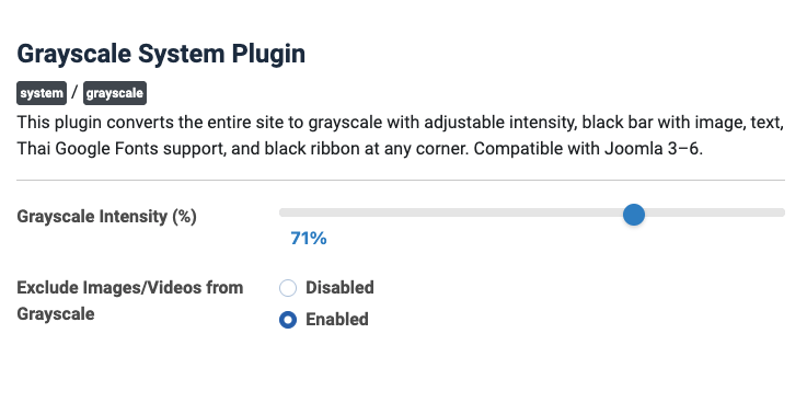 ปลั๊กอิน System - Grayscale ถูกพัฒนาขึ้นเพื่อใช้ในการปรับโทนสีของเว็บไซต์ให้เป็น “สีเทา” ทั้งหมด เพื่อแสดงความอาลัยหรือน้อมรำลึกถึงโอกาสสำคัญต่าง ๆ โดยสามารถปรับระดับความเข้มของสีเทาได้ตามต้องการ